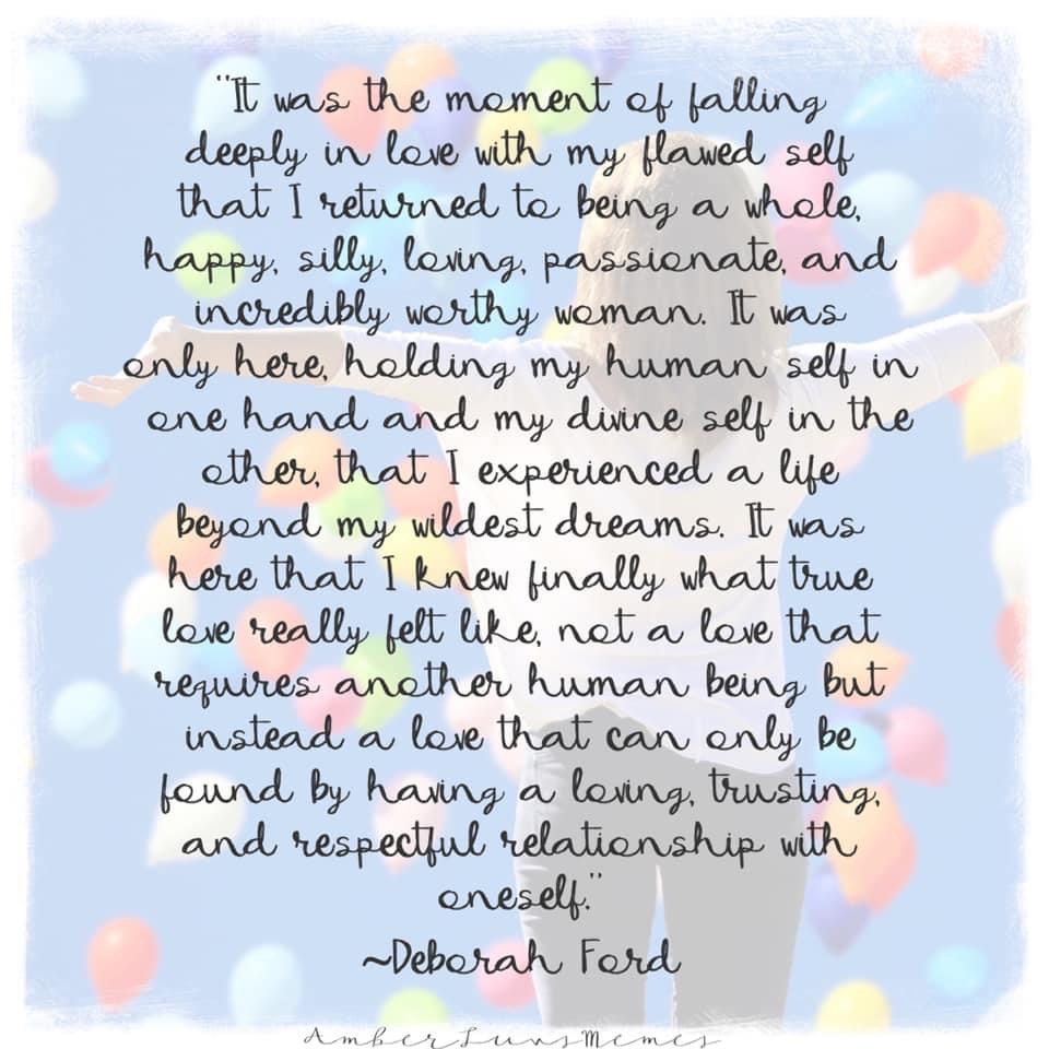 “It was the moment of falling deeply in love with my flawed self that I returned to being a whole, happy, silly, loving, passionate, and incredibly worthy woman. It was only here, holding my human self in one hand and my divine self in the other, that I experienced a life beyond my wildest dreams. It was here that I knew finally what true love really felt like, not a love that requires another human being but instead a love that can only be found by having a loving, trusting, and respectful relationship with oneself.”